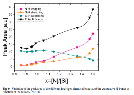 FTIR分析では、Si–H結合とN–H結合の量が組成に応じて変化しました。